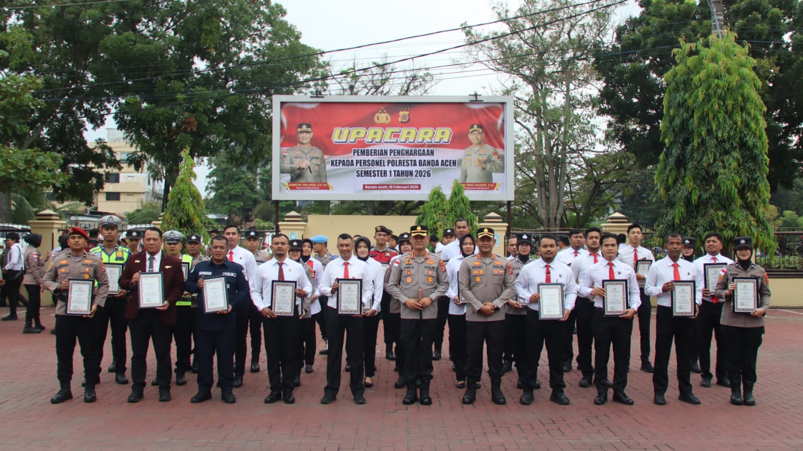 MRI– Banda Aceh | Polresta Banda Aceh kembali menggelar upacara pemberian penghargaan bagi personel berprestasi. Kali ini 50 personel menerima penghargaan yang diserahkan langsung oleh Kapolresta Banda Aceh Kombes Pol Andi Kirana dihalaman Mapolresta, Senin (16/2/2026).