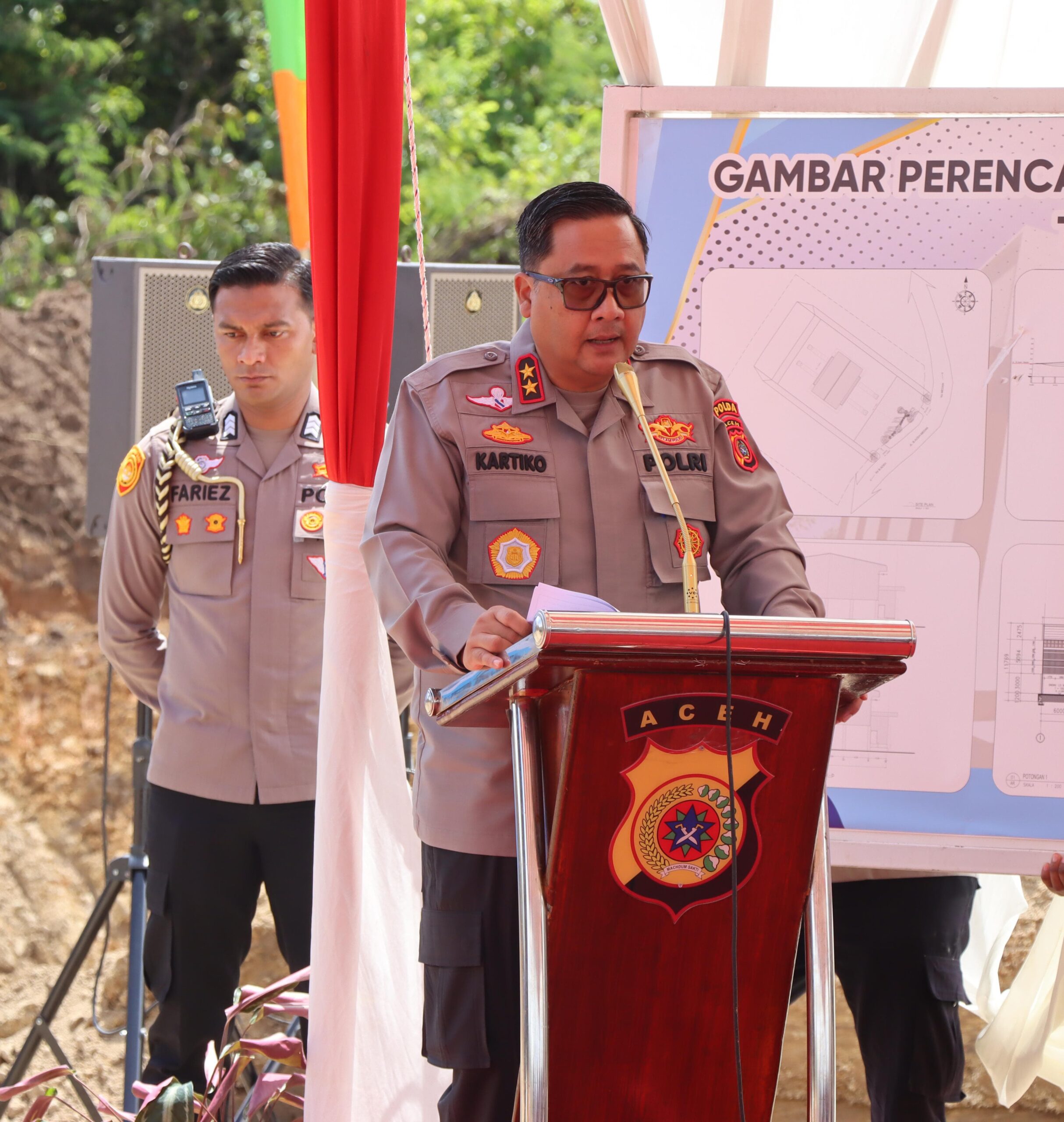 Pembangunan gedung ketahanan pangan tersebut ditandai dengan peletakan batu pertama oleh Kapolda Aceh Irjen Pol Dr. Achmad Kartiko, usai menghadiri secara virtual Ground Breaking Gudang Ketahanan Pangan Polri di SPN Polda Aceh, Kecamatan Lembah Seulawah, Kabupaten Aceh Besar, Kamis, 5 Juni 2025.