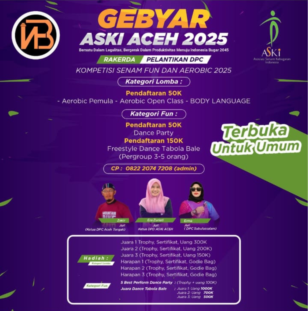 Pada kesempatan yang sama Ketua Panitia, Putri Dhihin menuturkan, Gebyar ASKI Aceh 2025 tidak hanya menjadi wadah silaturahmi, tetapi juga sarana untuk meningkatkan kreativitas dan keterampilan para penggiat serta pegiat senam di Aceh.
