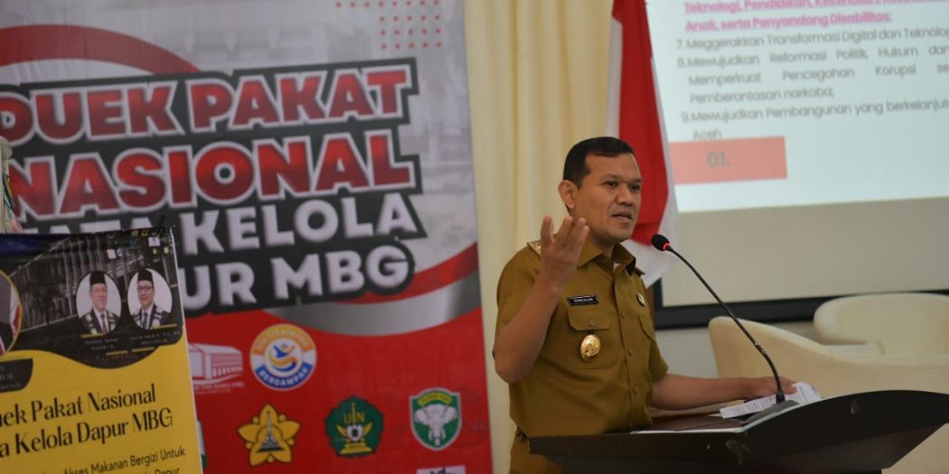 MRI – Banda Aceh | Wakil Gubernur Aceh, H. Fadhlullah SE., menegaskan bahwa program Makan Bergizi Gratis (MBG) merupakan salah satu pondasi penting dalam memperkuat sumber daya manusia (SDM) Aceh, sekaligus menjadi bagian dari upaya pengentasan kemiskinan, stunting, dan ketimpangan sosial. Hal itu disampaikannya saat menjadi keynote speaker dalam acara Duek Pakat Nasional Tata Kelola Dapur MBG yang digelar di Fakultas Ekonomi dan Bisnis Universitas Syiah Kuala (USK), Senin, 7 Juli 2025.