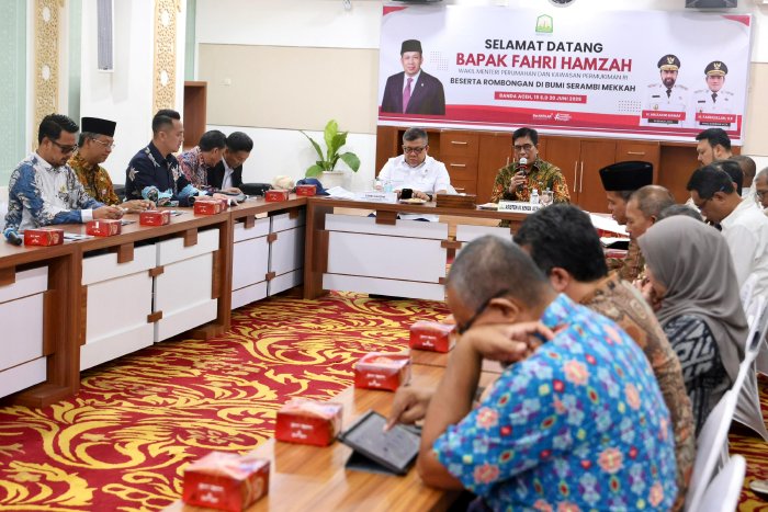 MRI – Banda Aceh | Wakil Menteri Perumahan dan Kawasan Permukiman Republik Indonesia, Fahri Hamzah, melakukan kunjungan kerja ke Aceh Kamis, 19 Juni 2025. Dalam pertemuan bersama jajaran Pemerintah Aceh di Ruang Potensi Daerah Kantor Gubernur Aceh, dibahas berbagai persoalan dan peluang dalam pembangunan perumahan dan kawasan permukiman, termasuk usulan renovasi dan pembangunan rumah layak huni bagi masyarakat miskin dan mantan kombatan.